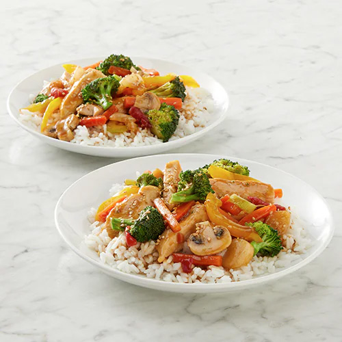 Push the chicken and vegetables away from the center of pan. Pour the sauce mixture into the center of pan; cook and stir until thickened and bubbly. Stir the sauce into the chicken and vegetables. Serve over rice.