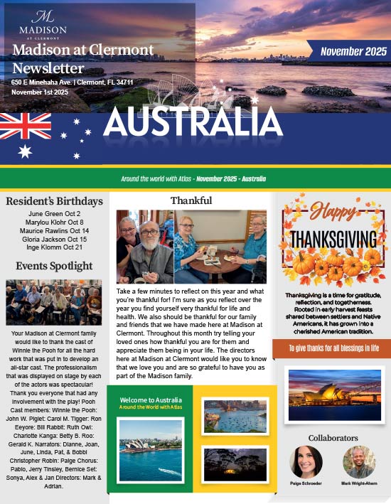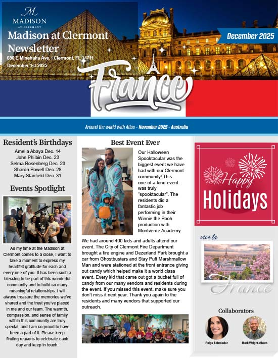 Please note that Madison at Clermont and its parent company, Atlas Senior Living, use cookies as outlined in Atlas Senior Living’s Privacy Policy, where you can individually opt out of this practice. By continuing to browse Madison at Clermont’s website, you agree to its use of cookies.
