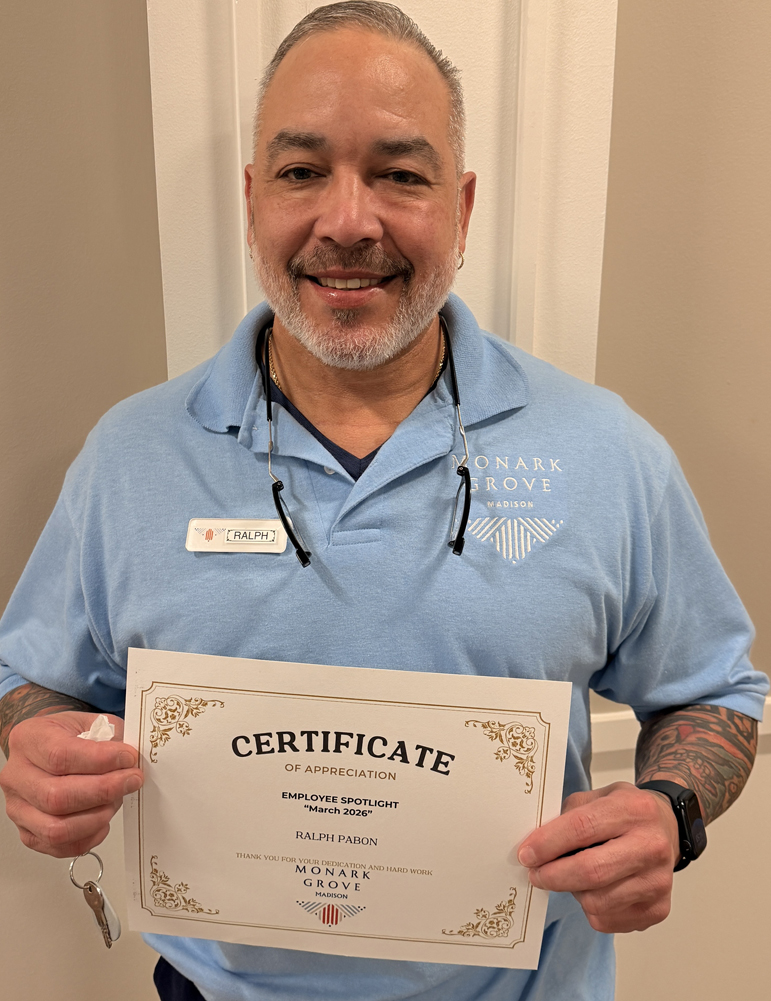 For the past five years, including three years with Monark Grove of Madison, Ralph has worked as a dedicated caregiver. He loves caring for our residents and values teamwork and a positive work environment.