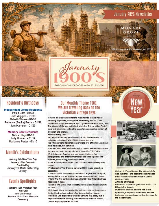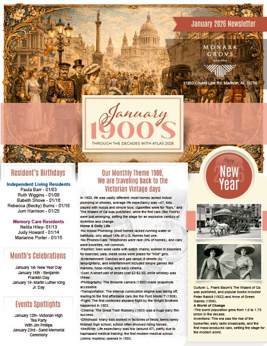Senior Care News at Monark Grove Madison, AL December 2025 November 2025 October 2025 September 2025 August 2025 July 2025 June 2025 May 2025 April 2025 March 2025 February 2025 January 2025 Independent Living Newsletter Memory Care Newsletter January 2026
