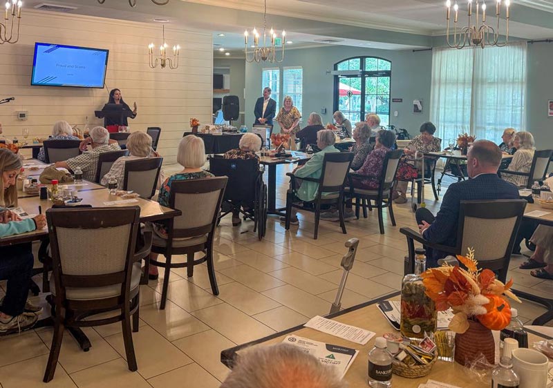 In today’s world, scams and fraud are becoming more sophisticated and widespread, affecting people of all ages and backgrounds. From phone calls and emails to online schemes, scammers are constantly finding new ways to trick individuals into giving away person information or money. While no one is immune, seniors are often at a higher risk because scammers frequently target their trust and generosity. That’s why it’s more important than ever for every generation to be informed, alert, and proactive in learning how to recognize and prevent fraud before it happens. To ensure that our residents were aware of this, we hosted a Fraud and Scammers Seminar with BankFirst. Here, they learned the signs, preventative measures, and responses that they must take in order to prevent fraud.