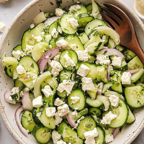 1. In a large mixing bowl, gently toss together diced cucumbers, creamy avocado, crumbled feta cheese, chopped red onion, and fresh parsley until evenly mixed.