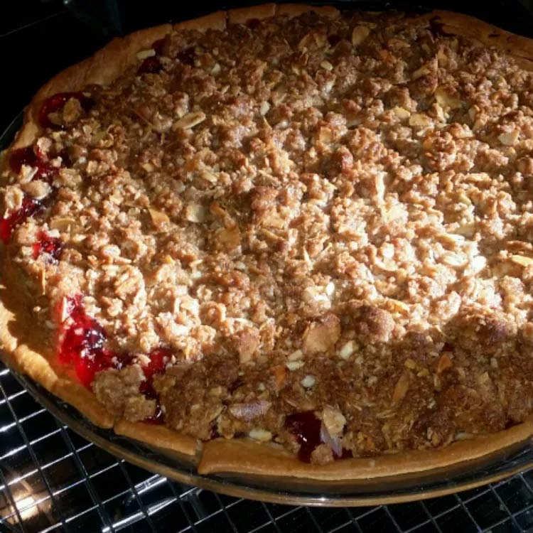 Stir together the cherry pie filling and cinnamon. Pour into the prepared pie crust. Sprinkle crumb topping over the pie, then sprinkle with the sliced almonds.